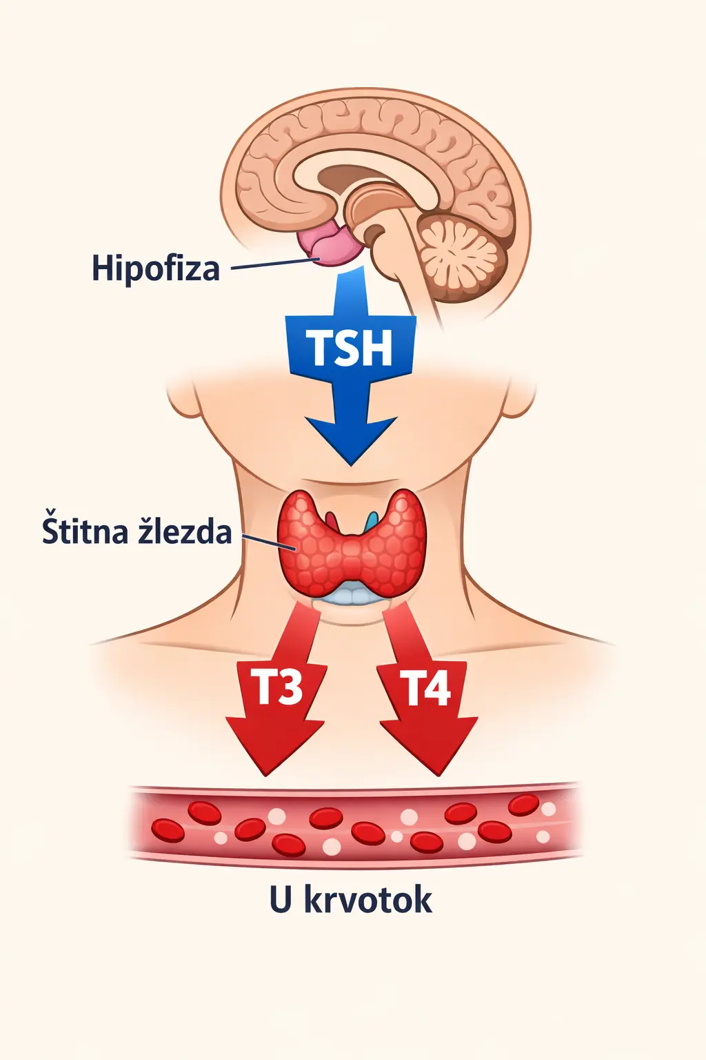 Evo kako taj sistem funkcioniše u praksi: hipofiza iz minuta u minut prati nivo tiroidnih hormona (koji se u rezultatima obeležavaju kao T3 i T4) u vašoj krvi. Kada primeti da nivo ovih hormona opada, hipofiza pojačava lučenje TSH-a. Taj hormon zatim putuje kroz krvotok direktno do štitne žlezde na vratu i daje joj jasnu komandu: „Ubrzaj rad i proizvedi više hormona!“.